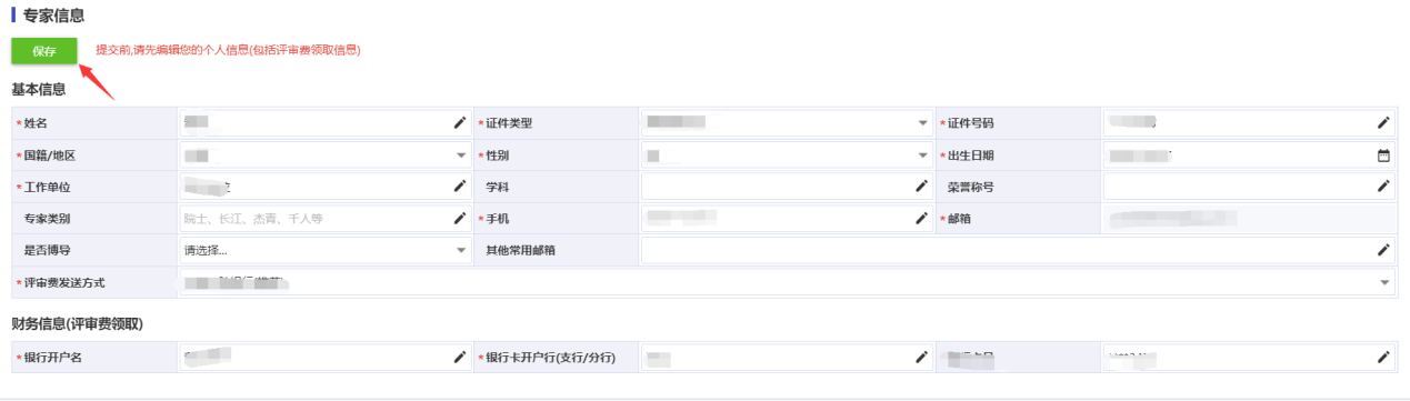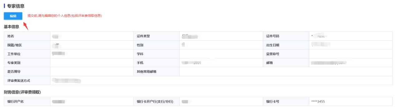 5、点击【编辑】按钮,完善个人信息以及评审费领取方式。然后点击【保存】按钮保存信息。