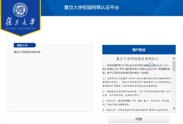 (2) 用户首次认证时需要同意《复旦大学网络服务使用协议》,如下图所示。