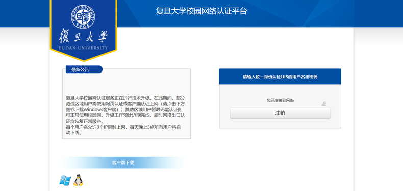 3. 系统默认登录后的次日凌晨3点自动注销登录。如需手动注销登录,请进入认证页面,点击“注销”。若认证页面已关闭,可打开https://wlrz.fudan.edu.cn,登录后点击“注销”(如下左图)。若为客户端认证登录,则点击“断开连接”(如下右图)。