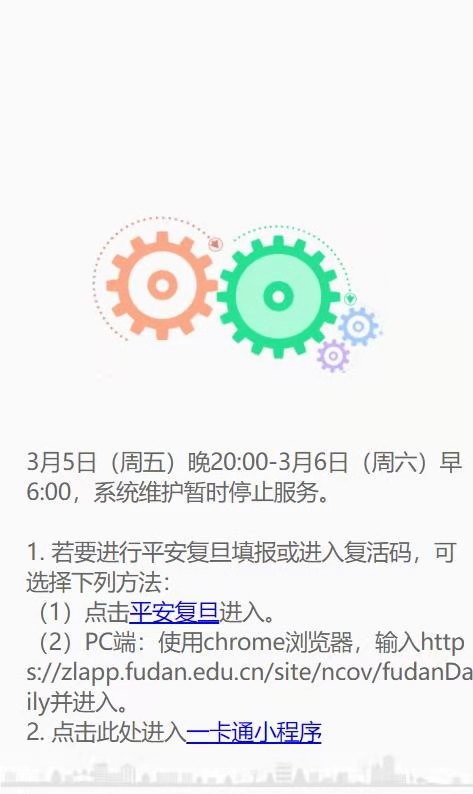 因“复旦eHall”小程序平台升级,信息办拟定于2021年3月5日(周五)晚20:00-3月6日(周六)早6:00进行停机维护,届时“复旦eHall”小程序及eHall网上办事大厅的部分填报和审批功能将无法使用。升级完成后,少部分用户打开小程序时会提示升级微信版本,根据提示升级微信版本之后可正常打开小程序。由此带来的不便敬请谅解,感谢您的理解和支持!
