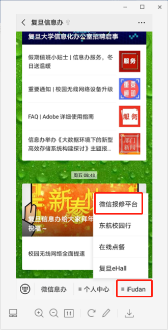 (2) 微信报修平台:通过信息办公众号“复旦信息办”底部,选择“iFudan” →“微信报修平台”进行报修。