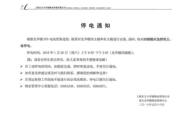 接光华楼物业通知,2018年1月20日(周六)8:00-17:00光华楼西辅楼将停电。届时该区域的有线无线网络也将会中断,给各位用户带来的不便,在此谨表歉意。望相互转告!