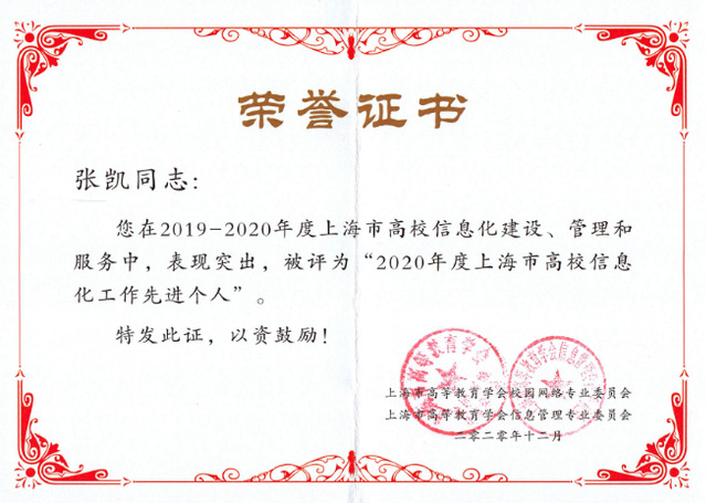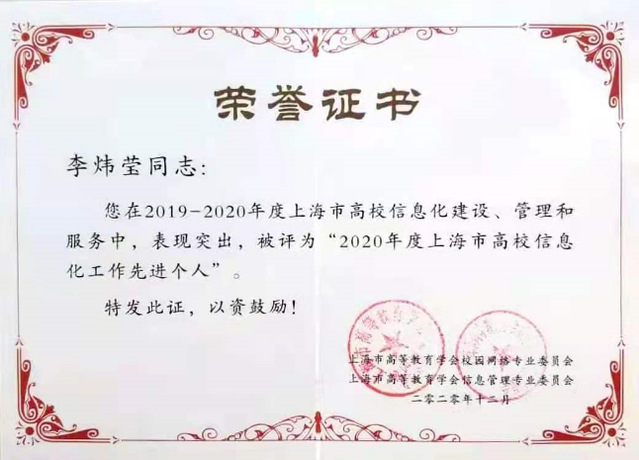 经专家评审,星空游戏app安卓张凯同志、李炜莹同志被评选为“2020年度上海市高校信息化工作先进个人”。