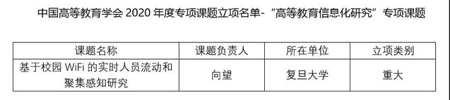 近日,从中国高教学会《中国高等教育学会关于2020年专项课题立项的通知》(高学会〔2020102号)获悉,复旦信息办申报的《基于校园WiFi的实时人员流动和聚集感知研究》项目,获批“高等教育信息化研究”专项重大课题。
