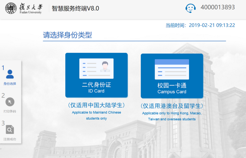 2月22日是复旦大学研究生新学期注册日。为推进学生服务平台化和电子化,改善跨校区学生注册不便的问题,研究生院和信息办在邯郸校区试点使用了新自助服务终端进行“人脸识别”自助注册。学生通过刷身份证或校园一卡通配合“人脸识别”技术进行身份认证,大约一秒钟即可完成新学期自助注册,为优化注册报到流程,降低跨校区运营成本。新自助服务终端还引入了标签打印技术,学生注册成功后,终端机会自动生成一张带注册信息的背胶贴纸,供学生张贴到学生证上。
