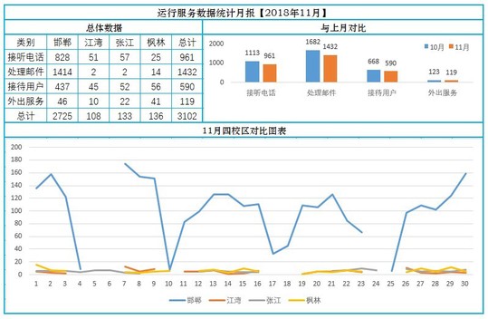 2018年11月,信息办服务台的运行用户服务总量共计3102件。四校区处理邮件1432封,其中邯郸1414封,其中邮件系统和UIS系统咨询仍稳居用户服务前两名。四校区接听电话961通,比上月略有下降。四校区接待用户590人/次,主要还是UIS系统、邮件系统、无线网络、有线网络等。四校区外出服务119次,主要服务为有线网络、无线网络、桌面服务等。