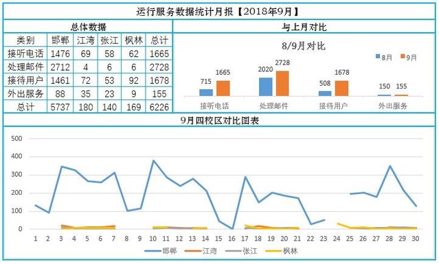 2018年9月,配合复旦大学新生入学及老生报到工作,星空捕鱼真金版游戏下载服务台的运行服务总量比与其他月份显著提升。其中,邯郸校区的用户服务数量最多共处理5737件,接听电话1476起,处理邮件2712封,接待用户1461起,外出服务88起。