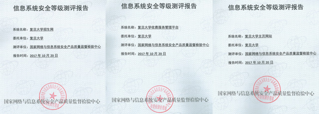 2017年10月,复旦大学主页网站、复旦大学招生网、复旦大学收费服务管理平台等重要信息系统顺利通过了国家网络与信息系统安全产品质量监督检验中心的信息系统安全等级测评,安全保护等级定为第三级,为校园重要系统的网络安全建设提供了参考标准和实践基础。