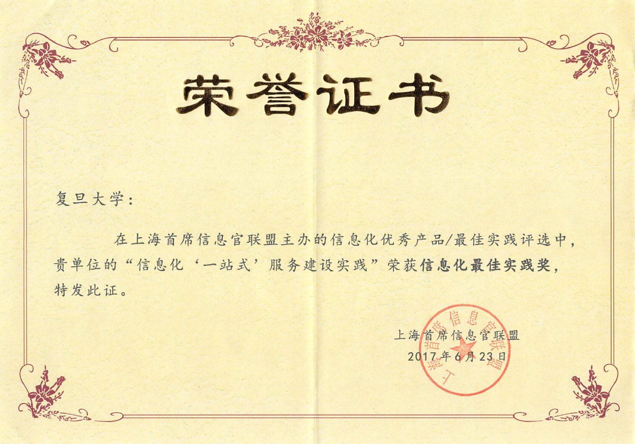 2017年6月23日,在上海首席信息官联盟2017年度会员大会暨第二届信息化优秀产品/最佳实践评选颁奖典礼上,复旦大学“信息化‘一站式’服务建设实践”荣获信息化最佳实践奖。