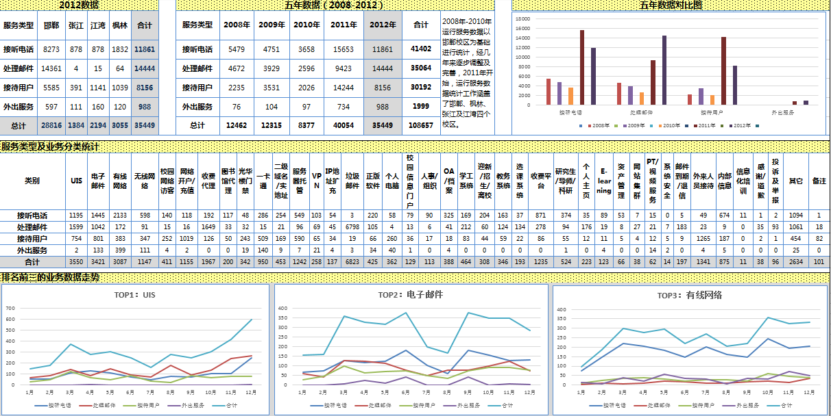 2012全年信息办运行服务的基本数据情况为:邯郸、枫林、张江及江湾四校区,服务总量为35449,其中接听电话11861通,处理邮件14444封,接待用户8156人次,外出服务988次。排名前三的业务分别为UIS、E-mail及有线网络。