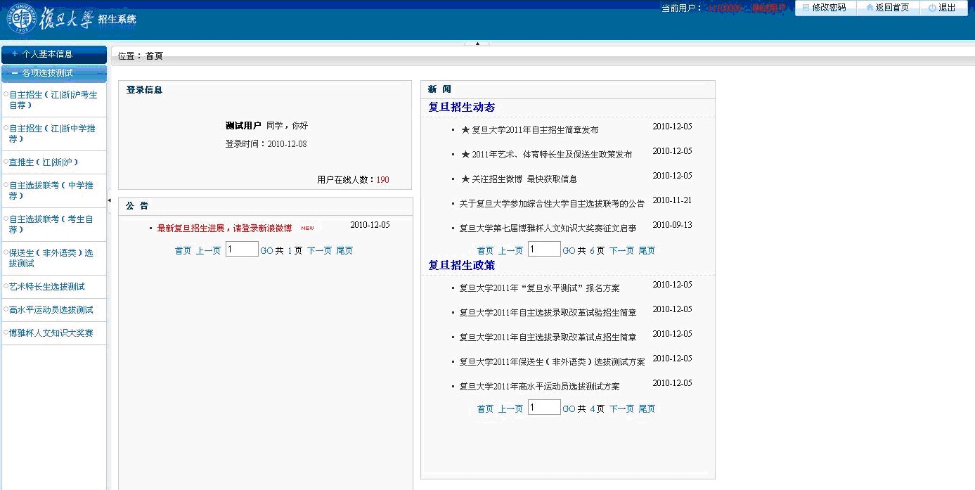 为配合2011年的自主招生工作,今年12月,复旦大学推出新版本科生招生网上报名系统。系统的服务对象为参加复旦大学自主招生的优秀高中考生,其中包含了博雅杯征文、艺术体育特长生、保送生等多个选拔项目。通过系统,学生和家长在网上就能方便地完成整个报名流程,学校也能便捷地完成审核工作。截至10年12月8日,已有1万余人顺利通过该系统完成报名。
