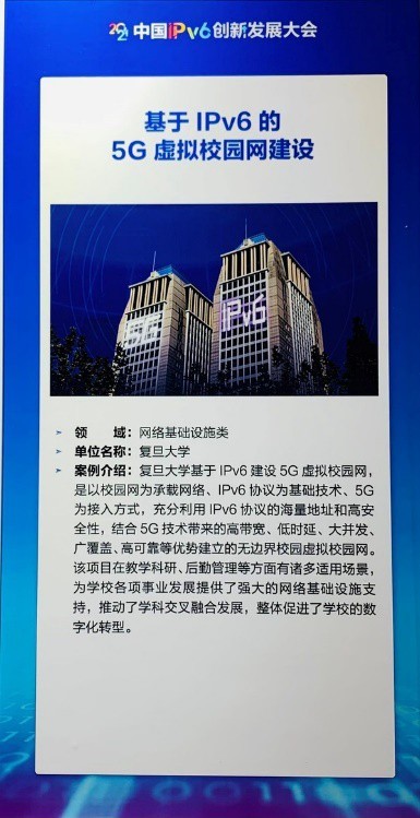 复旦大学“基于IPv6的5G虚拟校园网建设”项目成功入选由中央网信办信息化发展局和工业和信息化部信息通信发展司指导举办的互联网协议第六版(IPv6)规模部署和应用优秀案例。