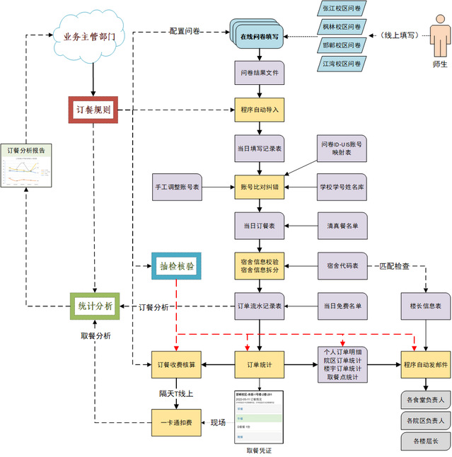信息办数据服务团队为订餐数据的处理、分析、展示提供了技术支撑。在数据处理方面,使用数据管理软件,编写自动化脚本,完成订餐数据的清洗、转码、检验、统计、核算计费,将结果自动分发给楼层长、驻楼辅导员、园区、食堂等订餐各环节人员。对订餐和取餐需要的基础数据进行收集梳理和维护,包括:区域楼宇房间字典表、需清真餐学生信息表、驻楼辅导员信息表、免费学生名单、每日菜单,并同步给相关系统。在数据分析方面,根据订餐数据、取餐扣费数据进行分类汇总统计、综合比对分析,形成每日订餐数据分析的可视化报告。统计指标包括:取餐时长、取餐人数、忙时闲时、订餐数和取餐数比对、每分钟取餐人数,按照取餐点和取餐刷卡设备2个不同的维度统计等。同时,持续不断改进数据统计指标,为学校相关业务部门研判分析提供数据支撑。在数据展示方面,开发了“取餐凭证”功能并在“复旦eHall”小程序上发布,方便了同学们的取餐与验证。