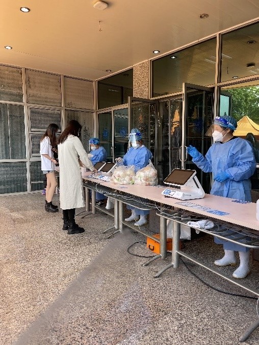 该方案提出在不同网格点设置供餐点,由总务部门将餐食送至各供餐点,学生以寝室或相邻寝室为单位派代表到取餐点按指定时段错峰刷卡取餐。三校区共计21个取餐点,涉及62台刷卡设备。为保障各个取餐点的设备正常使用,信息办紧急协调人员在现场各点位进行了一卡通专用网络及设备调试。