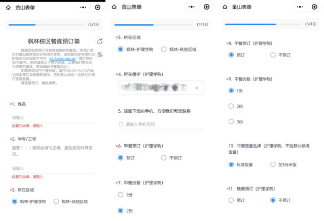自学校进入准封闭管理以来,顺应疫情防控形势的不同需要,校内师生的供餐制度进行了多轮的革新。根据邯郸、江湾、张江、枫林的不同情况,目前四校区七个食堂实行着不同的供餐方案,师生用户通过“订餐小程序”订餐后,信息办统计分发数据,再由志愿者配送或师生现场刷卡取餐的模式来保障每一顿的配餐。