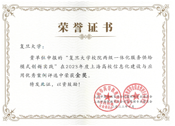 经专家评审,星空游戏app安卓申报的案例“复旦大学校院两级一体化服务供给模式创新实践”获得2023年度上海市高校信息化建设与应用优秀案例金奖。