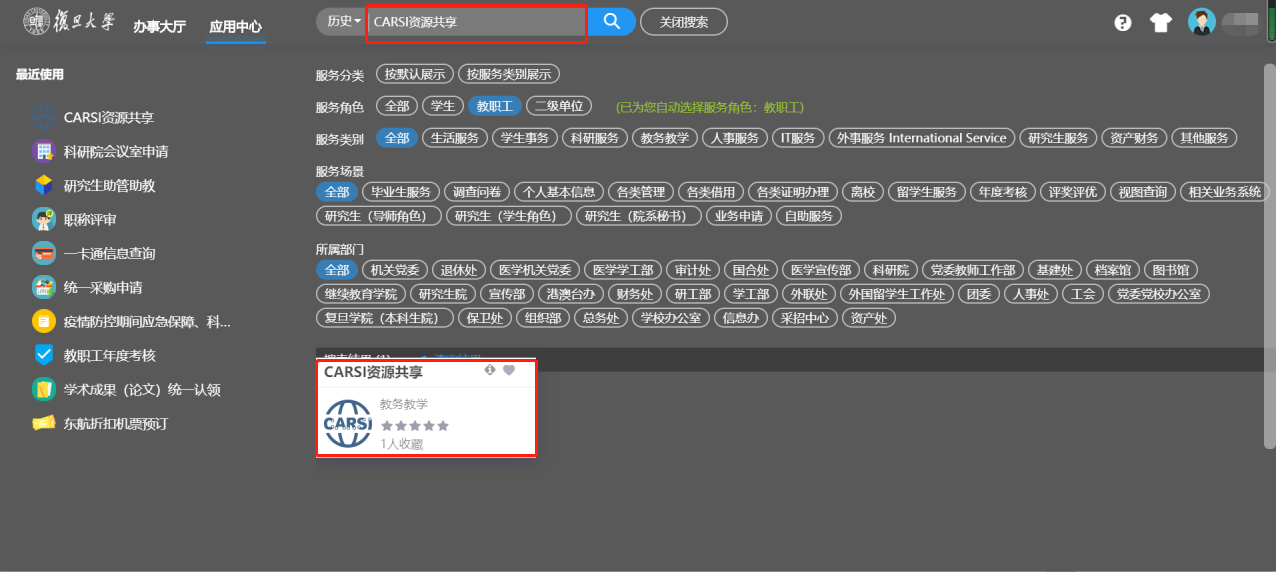 2. 在搜索框内搜索“CARSI资源共享”,进入服务。