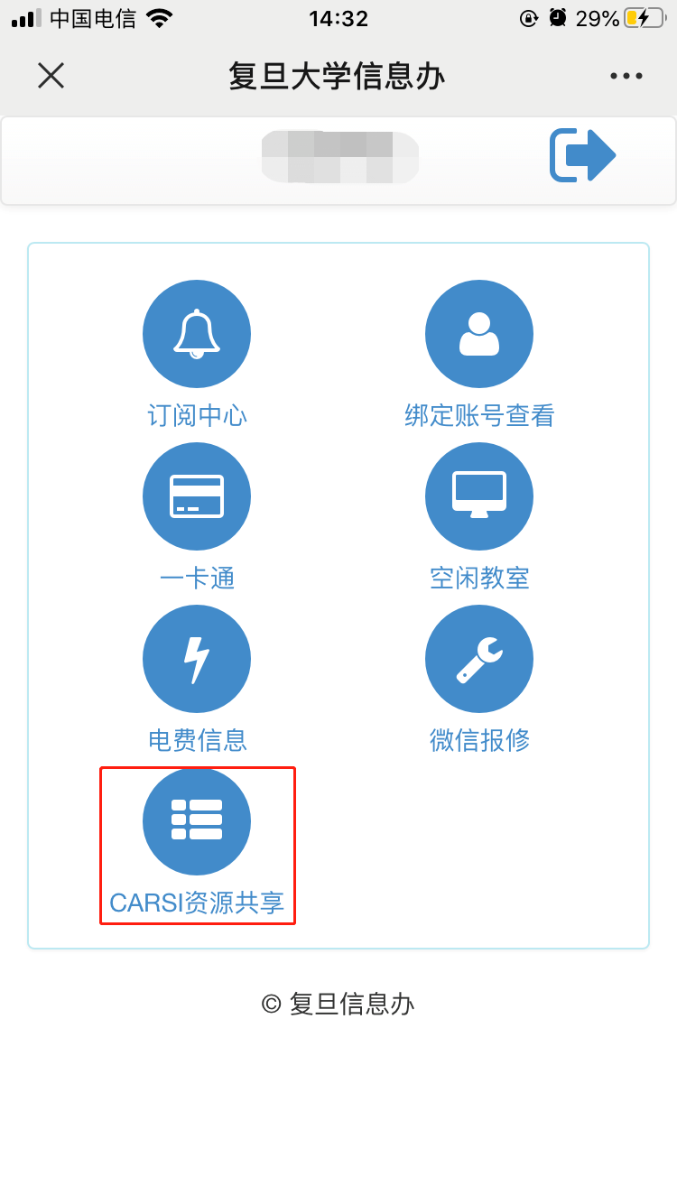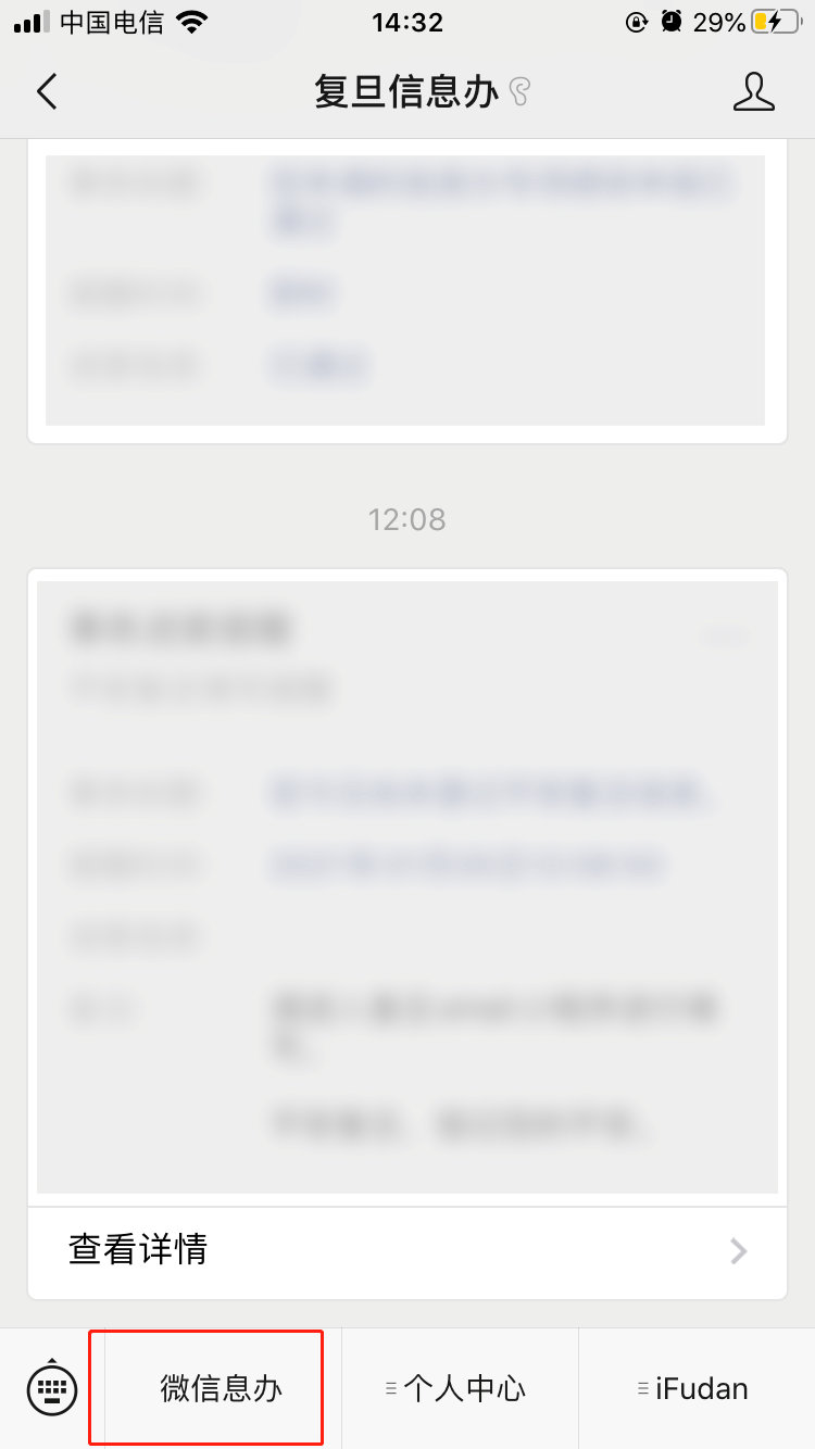 1. 关注并进入公众号“复旦信息办”,点击左下角“微信息办”