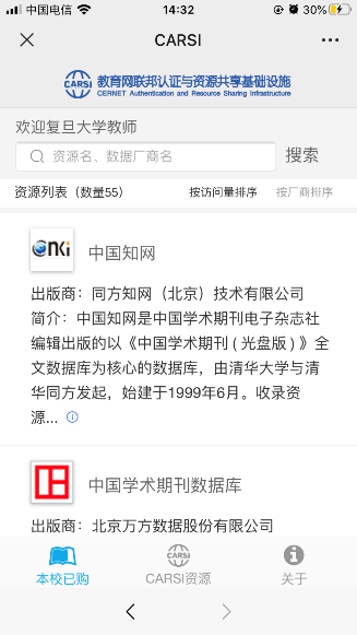 1. 可通过“本校已购资源”、“CARSI全部资源”、搜索框查找所需资源进行访问。